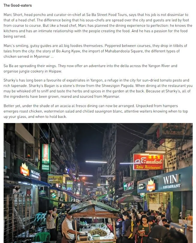 An ode to Myanmar street snacks written by an 80yr old local. I like the sound of the singing contest between vendors held in 1942. Still today I hear some beautiful voices walking amongst the vendors.